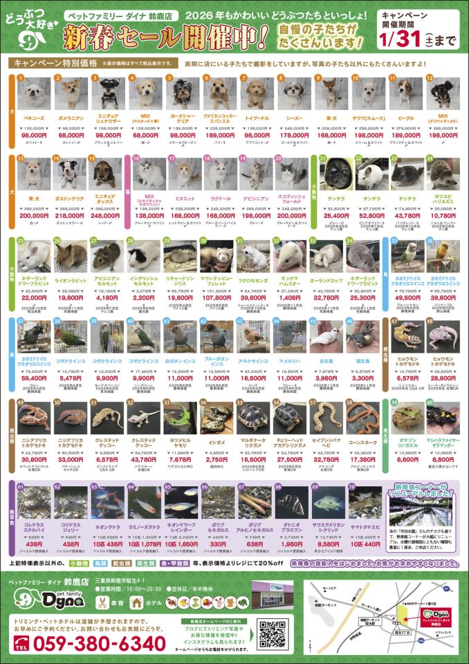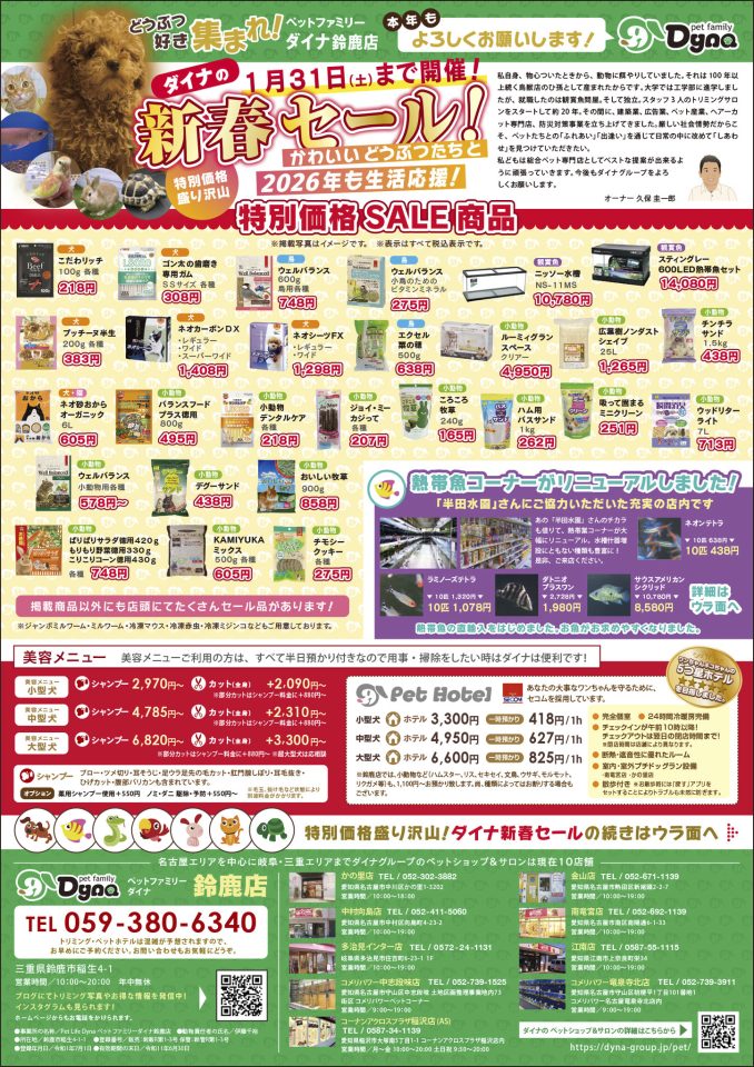 ダイナ鈴鹿店はトリミング・ホテルのみならず、「犬・猫・小動物・鳥・爬虫類・観賞魚・昆虫などの販売」もさせていただく総合ペットショップです。
